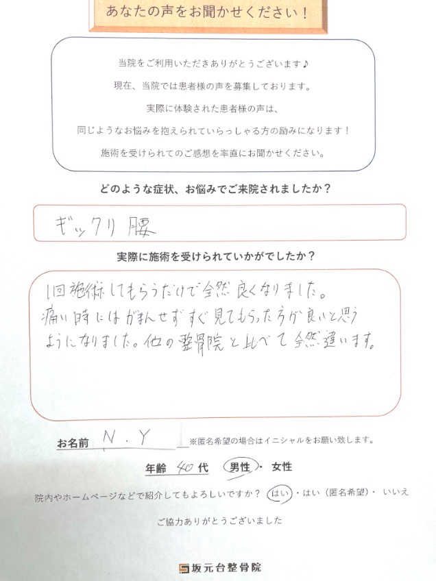 ギックリ腰をくり返す慢性腰痛持ちの40代男性患者さんの声