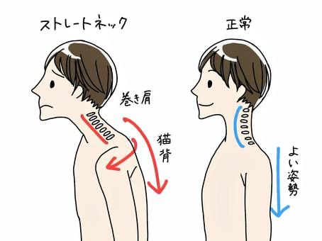 このような姿勢になってしまうと、首肩まわりの筋肉が伸ばされながら収縮することにより血行不良を起こし、肩こりを引き起こしてしまう原因になってしまいます。