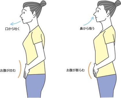 やり方としては鼻からゆっくりと息を吸いこみ、おへその下に空気を溜めていくイメージでお腹を膨らませます。そして口からゆっくりと息を吐き出し、お腹をへこませます。この時、吸う時の倍くらいの時間をかけるつもりで吐くのがポイントです。