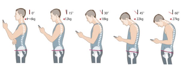 人の頭の重さは約5~6キロあると言われています。ですので頭が前に倒れる角度によって負担が増えていきます。いかに少ない角度でスマホなどの画面を見るかが大事になってきます。
