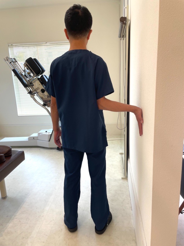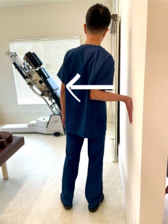 そして壁側につけている方の肘が背中の中心に向かってスライドしていくような動きで壁に寄りかかって行きます。肘と背中がこすりあう形がベストですが、力入れて無理に行うと肩を痛めてしまうかもしれませんので軽く痛気持ちいい程度で行います。この時、体幹をまっすぐしたまま壁に寄りかかっていきます。
