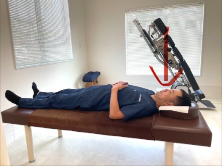 猫背が強くて壁に頭がつかない人は床に枕をして寝ていただいた状態で、同じようにアゴを引いて枕を押し付けながら深呼吸していただけたらと思います。