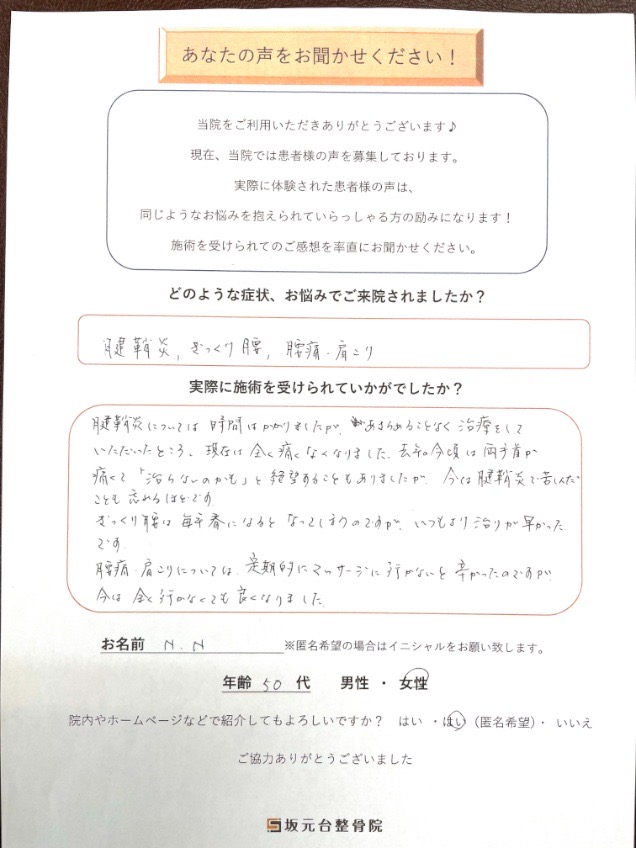 腱鞘炎については時間はかかりましたが、あきらめることなく治療していただいたところ、現在は全く痛くなくなりました。去年の今頃は両手首が痛くて「治らないのかも」と絶望することもありましたが、今は腱鞘炎で苦しんだことも忘れるほどです。