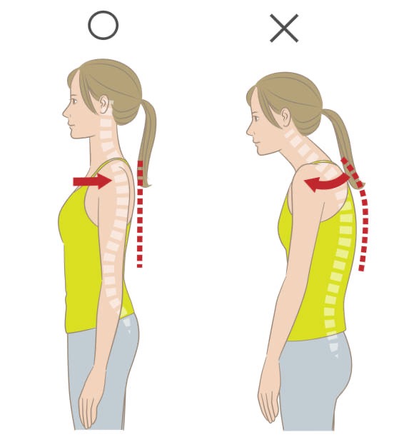 胸を張るようにして、体が前かがみにならないように注意します。