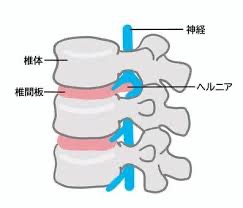 椎間板ヘルニアとは簡単に言えば、背骨の骨と骨の間にあるゼリー状のクッション(椎間板)が破けて飛び出してしまい、神経に触れて痛みやしびれが出ている状態のことを言います。