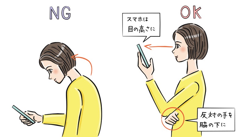 ・スマホやパソコンは目線の高さに合わせて見るようにします。