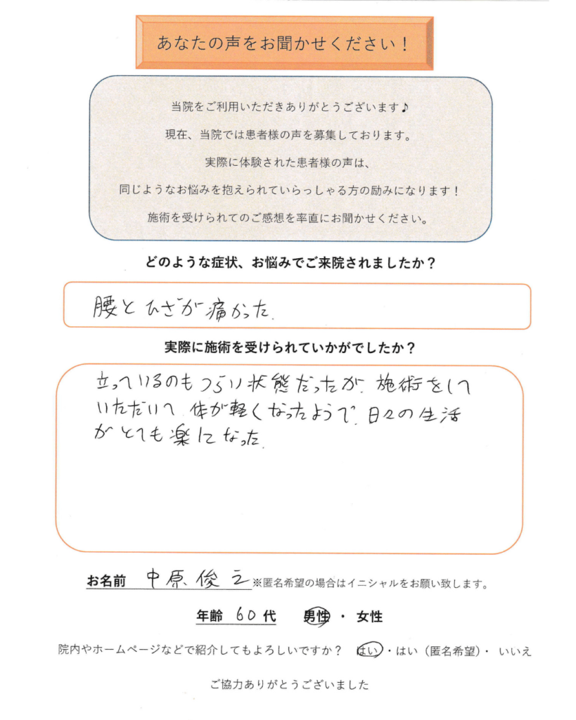 立っているのもつらい状態だったが、施術をしていただいて体が軽くなったようで、日々の生活がとても楽になった。